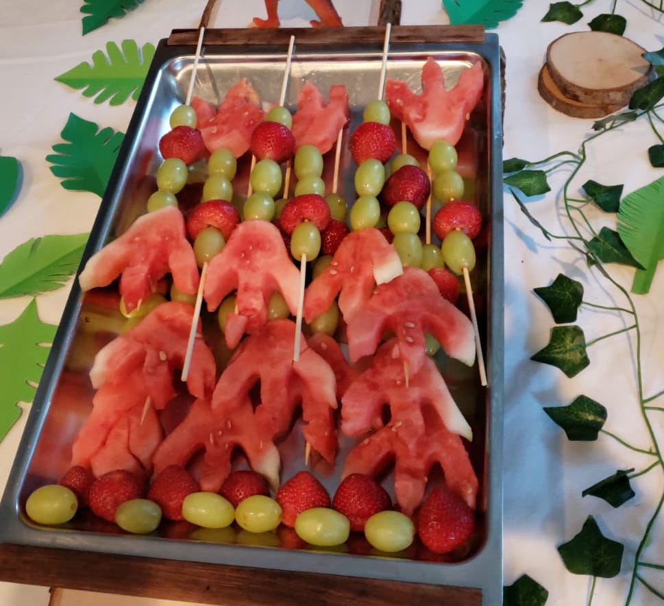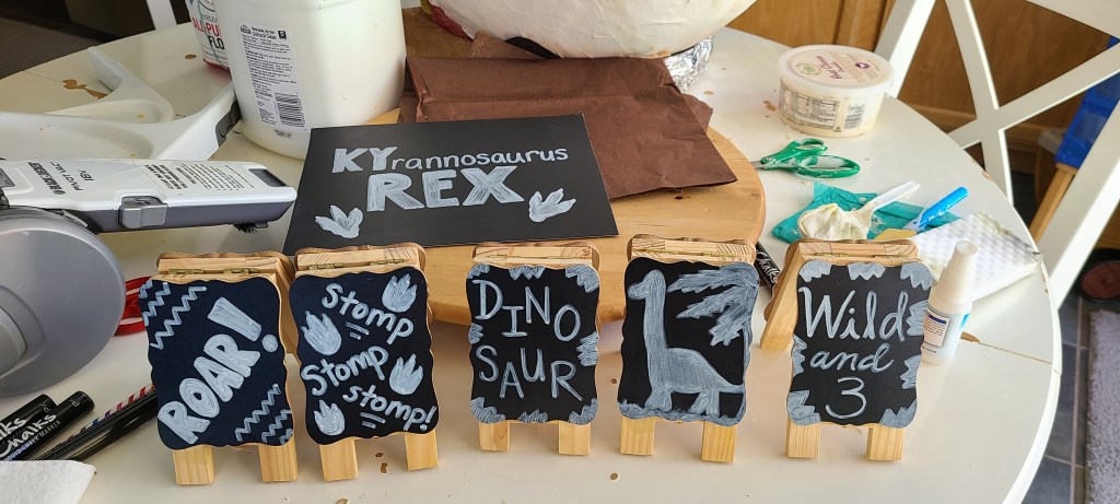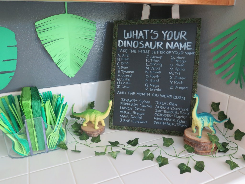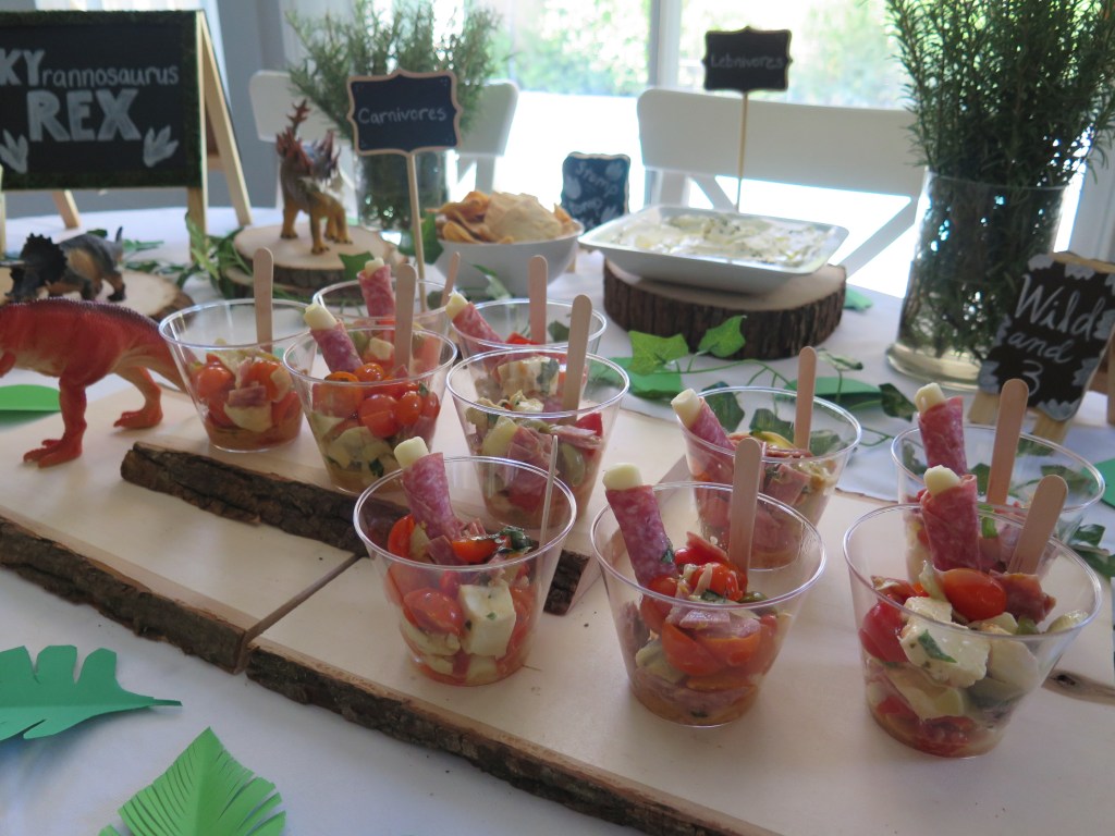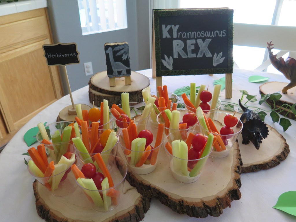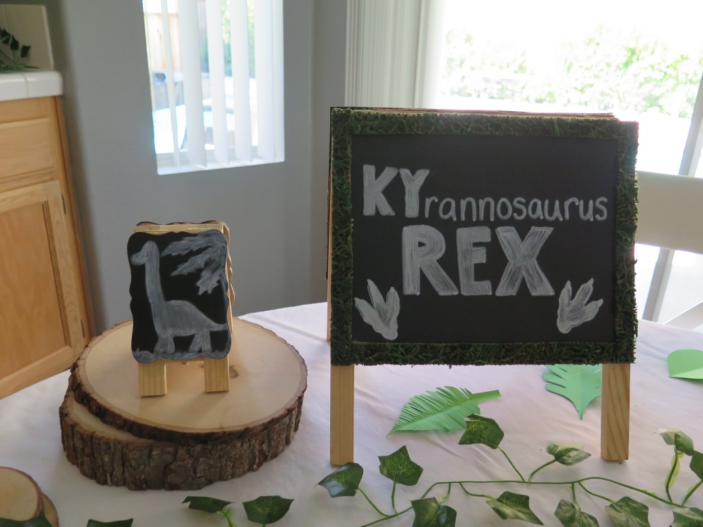 I used some round and rectangular tree stumps and some small black chalkboard stands I purchased at a local craft store (similar to Michael’s) as the foundation for the food table, along with some plastic dinosaurs and paper cut-outs of leaves in various shapes and colors that I laid around the table, and fresh rosemary from my mom’s garden.