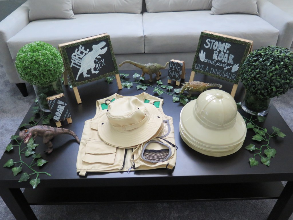 When you first walk in, there is a table set up for guests to pick up a dino adventure hat along with a hat and vest for kids.  I purchased these plastic dinosaurs from Amazon to decorate the table with.