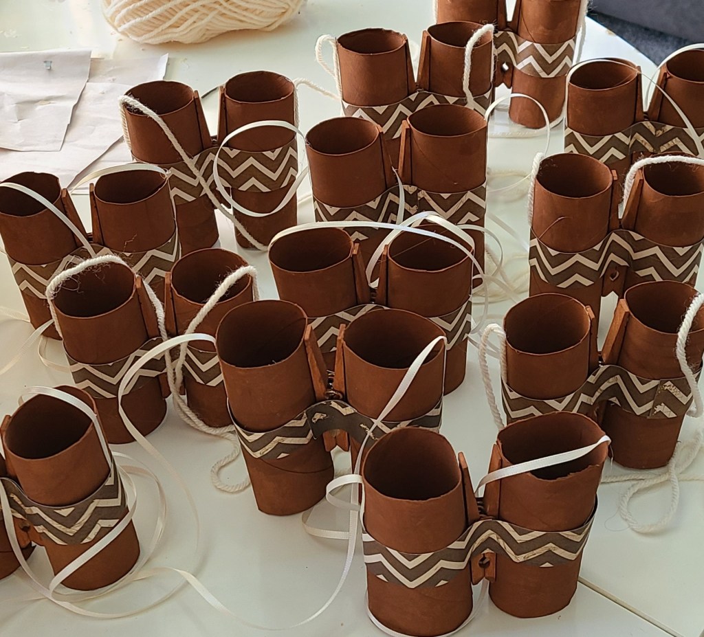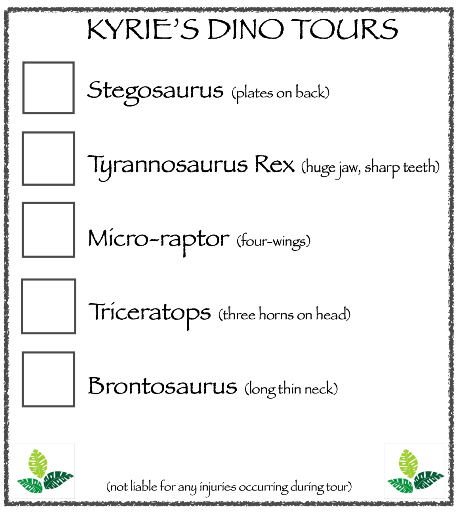 Guests walk up to the booth, two at a time, and say they would like to go on a dinosaur tour.  Cadence and Kyrie give them a flashlight, a set of binoculars we made out of toilet paper rolls, and a dino chart on mini clip boards with a mini pencil.