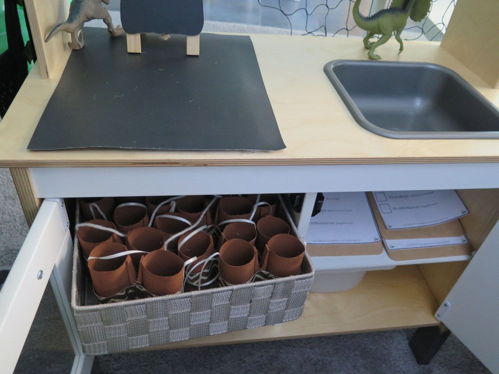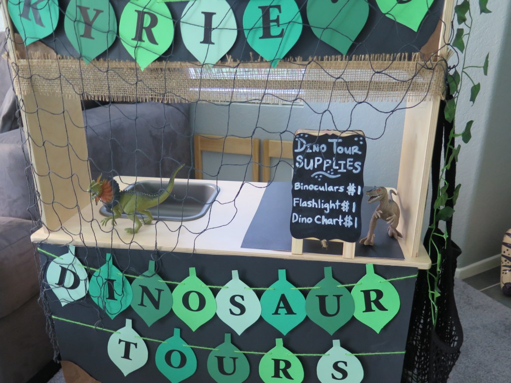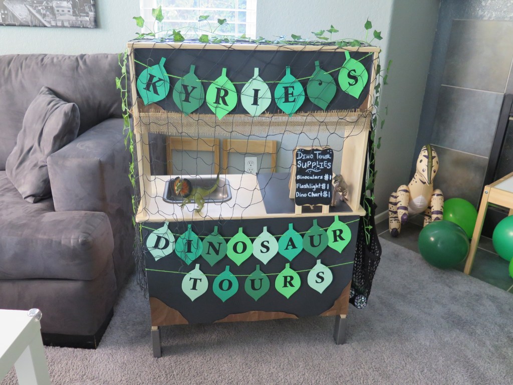 This dinosaur tour booth/dinosaur hunt is one of our all-time favorite birthday party activities.  I have an Ikea kitchen that I transform into a themed booth for every birthday party we’ve had.  It has been a bakery stand, dinosaur hunt booth, a princess tower, etc. etc. etc. LOVE this IKEA kitchen sooo much.  Here are some pics of the dino tour booth I made for our dino hunt.