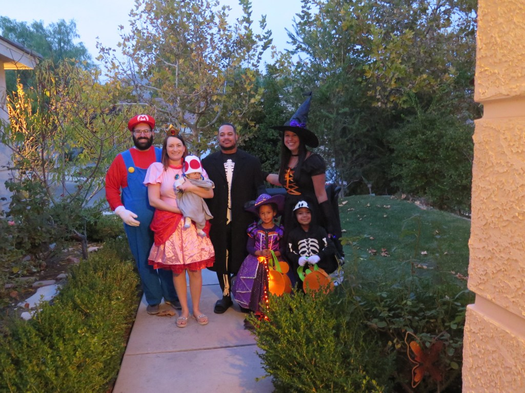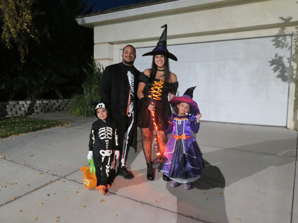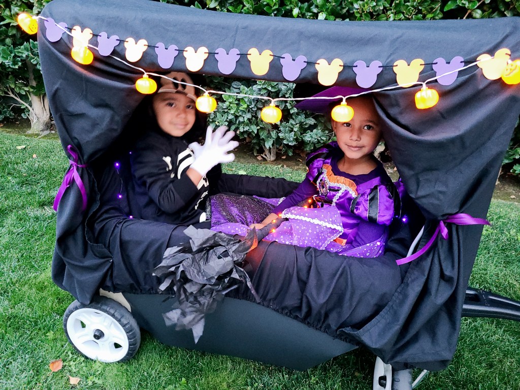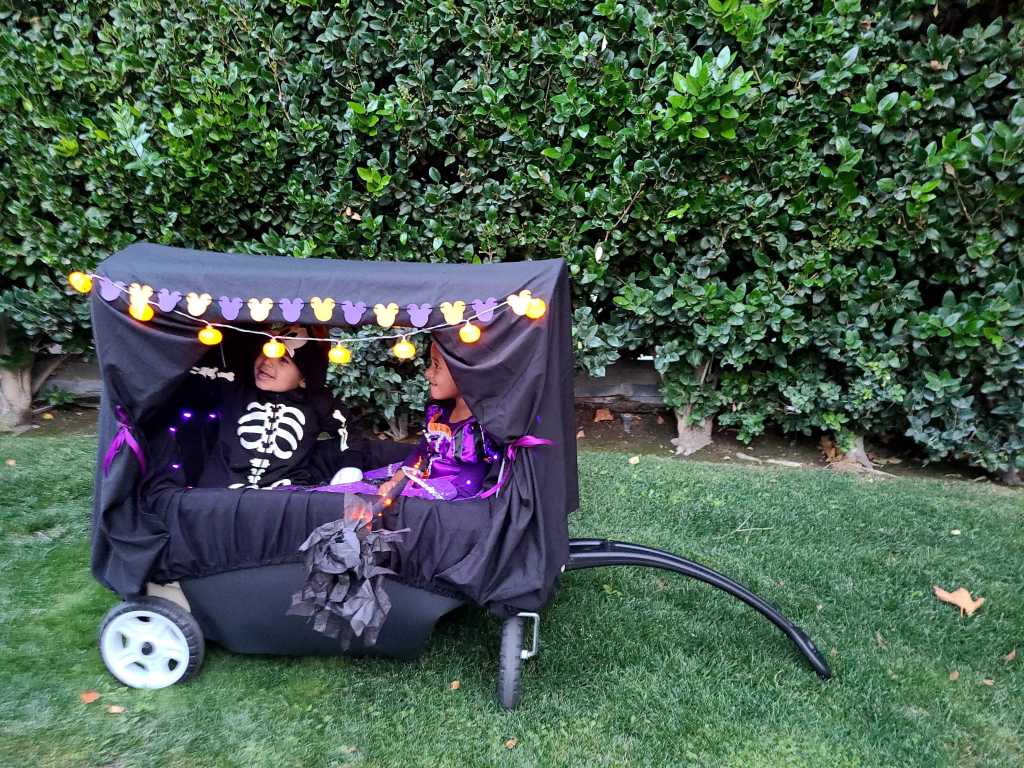 I felt the need to go a little over the top for Halloween and turned our two seater wagon into a Spooky Mobile that matched my kids’ costumes. We got loads of compliments while trick or treating and my kids loved riding in it. Here’s a link of a covered two seater wagon similar to ours. This project was surprisingly simple and fun to put together. Here’s how this spooky creation came to be..