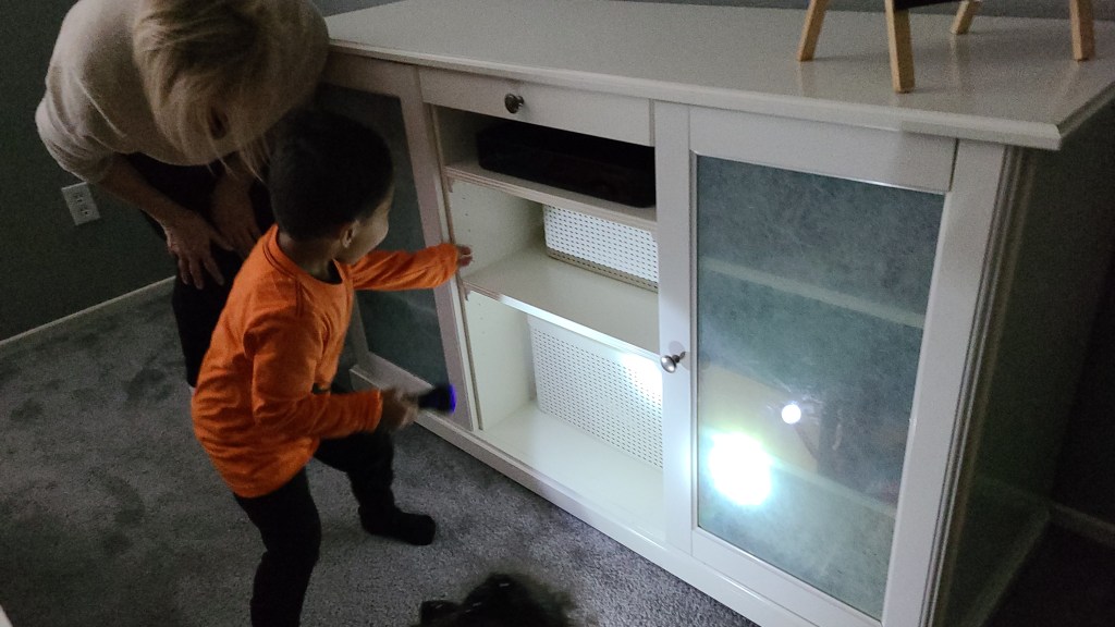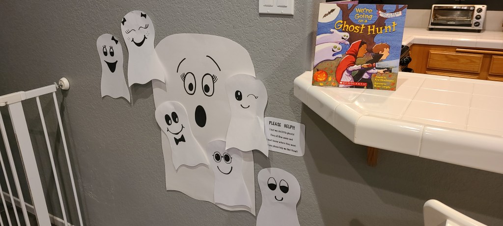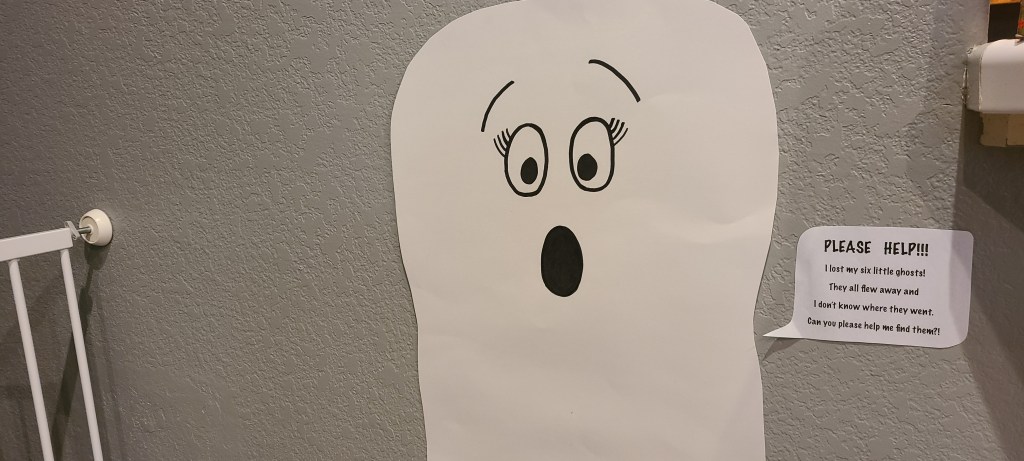 I started this game by reading the book We’re Going on a Ghost Hunt. Then the kids read this note from Mama Ghost and helped find her six missing ghostlings.