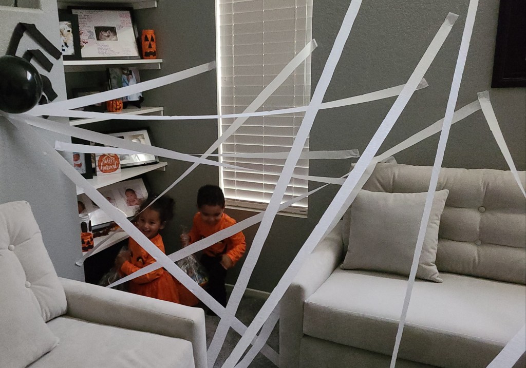The final game of the evening, Spider Web! The kids were so excited to play this game. They had to crawl underneath the spider web to reach their Halloween gift baskets and boy were they up to the challenge!!