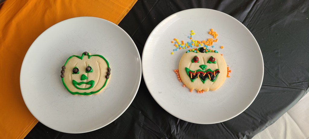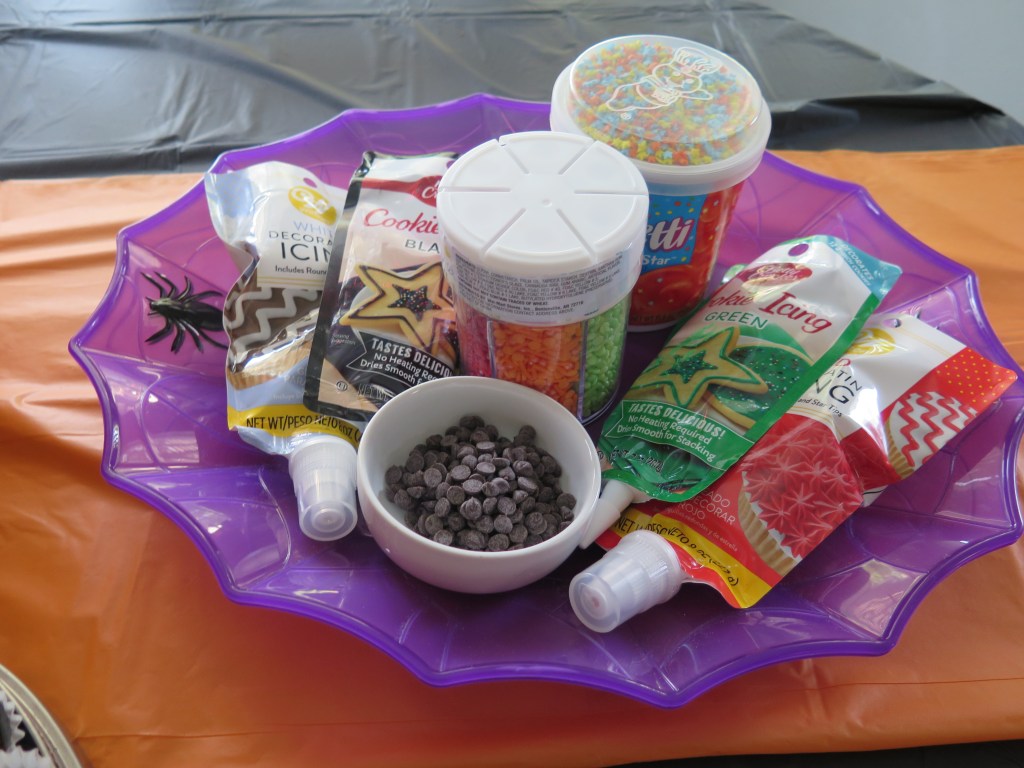 I found some plain pumpkin shaped sugar cookies at our local grocery store and used some icing, sprinkles, and chocolate chips I had on hand for our cookie decorating station.