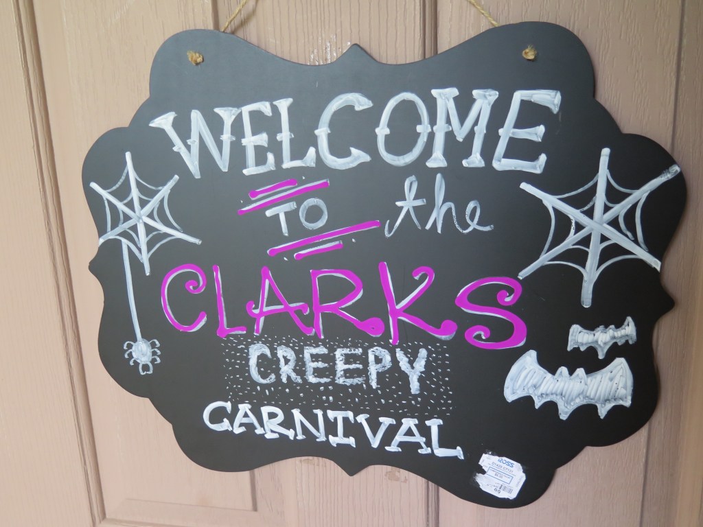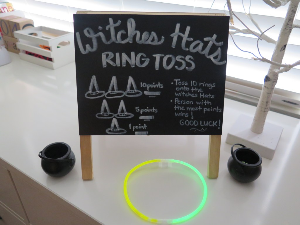 I set up a different game in each room of the house. The first game was called Witches Hats Ring Toss. I put a Halloween ring in the mini witch cauldrons on either side of the game sign. The winner got to choose the cauldron first.