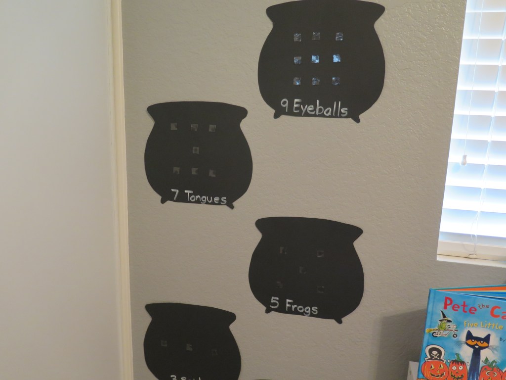 I taped four witches cauldrons onto the wall, filled a pumpkin basket with the exact amount of tissue paper balls needed for the game, and placed a grabber in front of the basket.