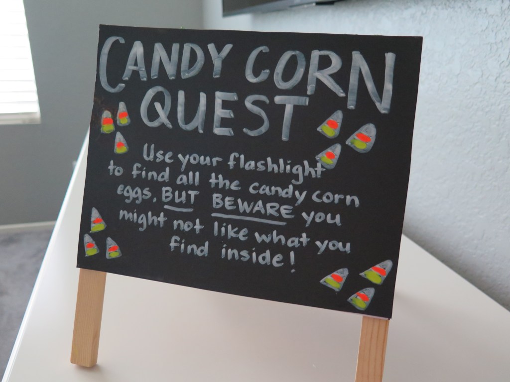 My kids are obsessed with any kind of hunt game. I knew this one would be a hit. I filled some eggs (a.k.a. candy corns) with little goodies and others with spider rings.