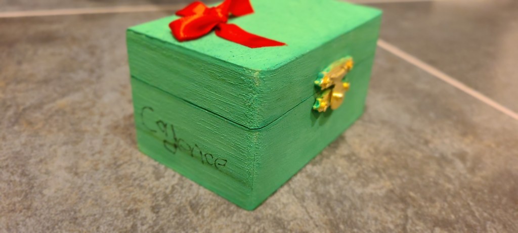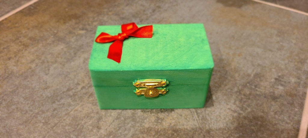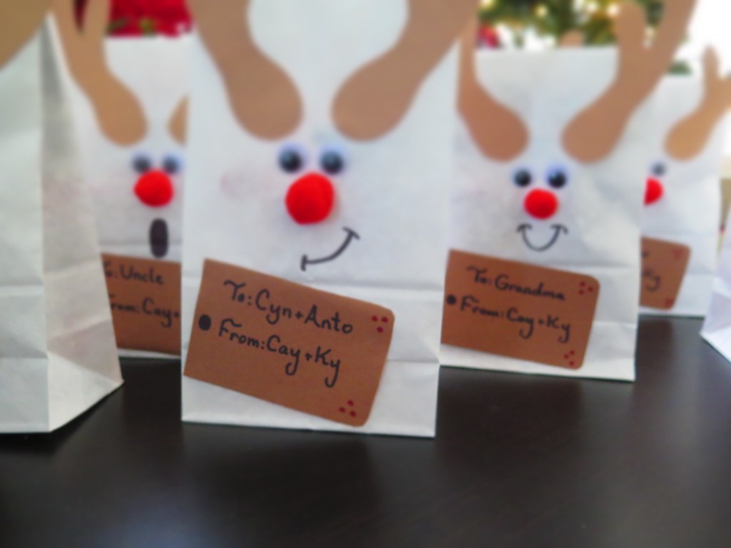 They used tempera paint to paint half the boxes green and half the boxes red. I added a bow with a dab of hot glue once the paint dried