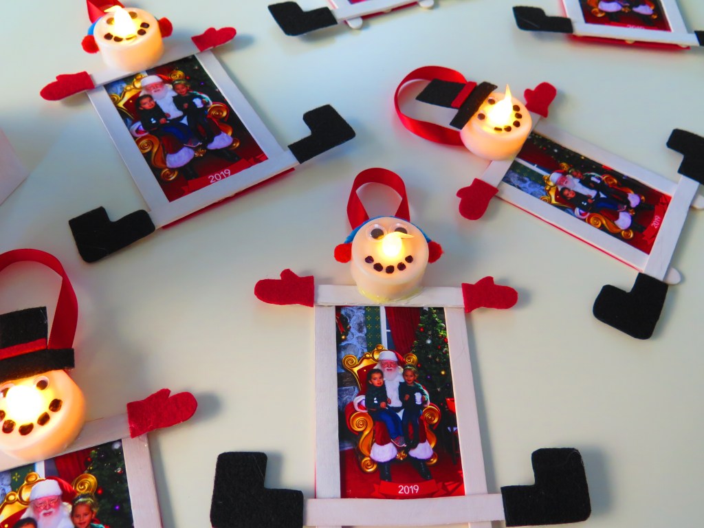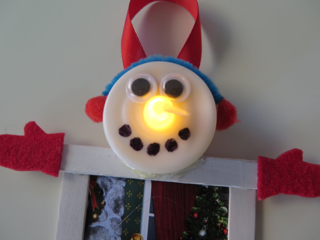 I made five dots under the snowman’s nose with black sharpie marker. Important Tip: make sure the on/off switch on the back of the tea light is at the TOP before gluing the googly eyes and drawing on the mouth because the BOTTOM portion of the tea light is going to be glued onto the frame 😉
