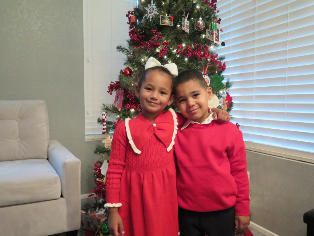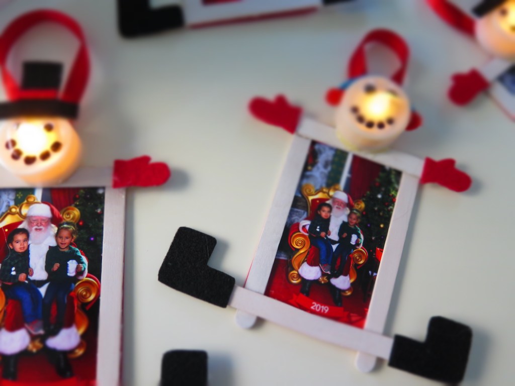 I cut out red construction paper to glue onto the back of the photos. My kids wrote their names and the year on each one. While they were busy doing that, I hot glued everything onto the tea lights, then hot glued the tea lights onto the frames
