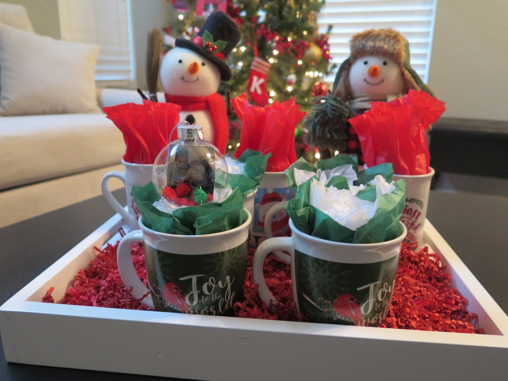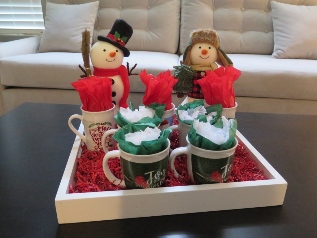 We wrapped the ornaments up in tissue paper and put them in these festive mugs