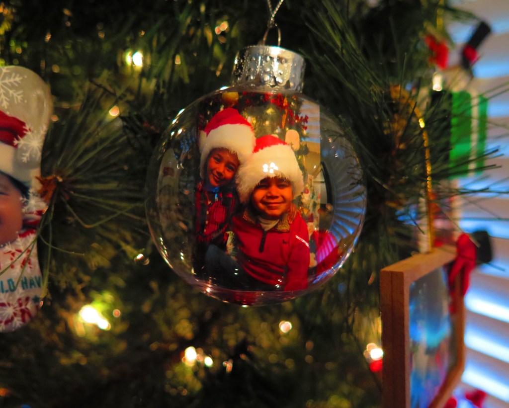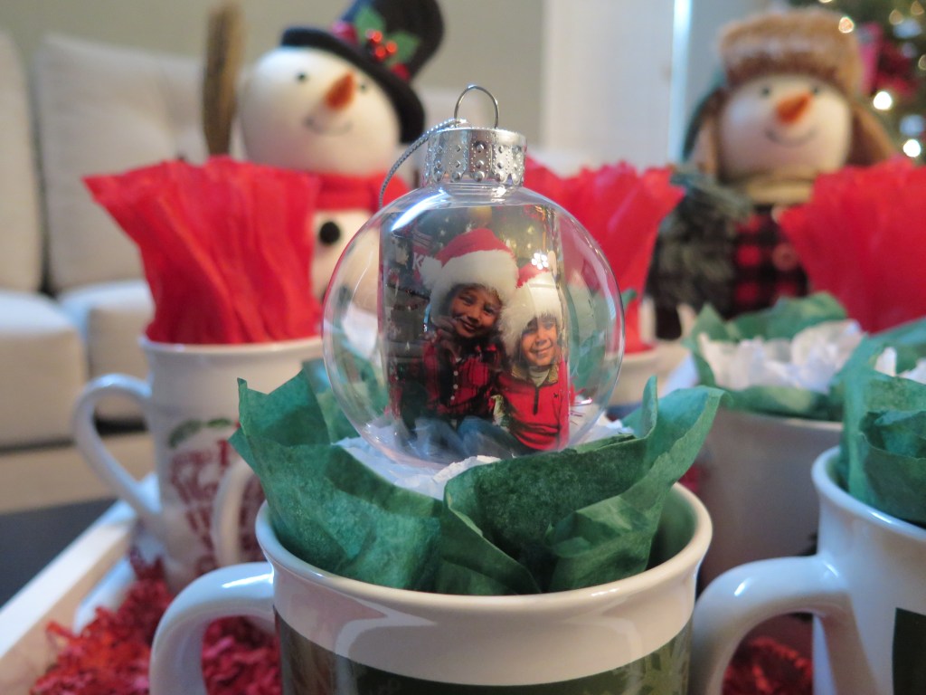 I ordered two sets of wallet sized photos and glued them back to back. I carefully rolled the photo up so it could fit through the ornament opening. My kids placed the photos inside each one and put the ornament tops back on. Tip: Use a sharpie to write the year on the ornament or on the photo itself so you remember when this gift was made