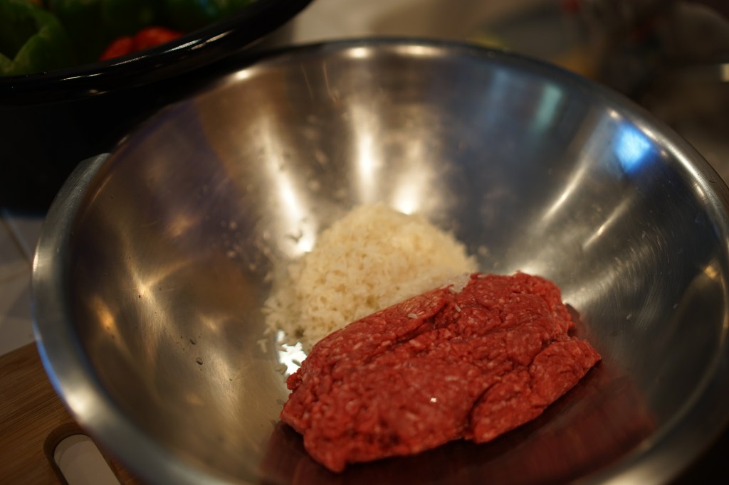 Put rice and ground beef in a large bowl