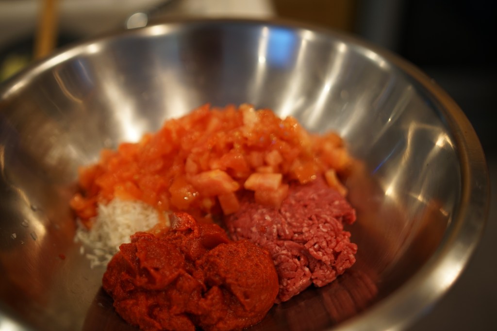 Dice tomatoes, add to meat rice mixture