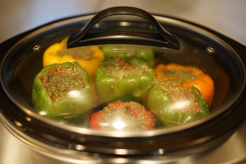 Use all the stuffing to fill the bell peppers. If needed, push the stuffing down to add more (don’t worry about overstuffing the peppers, the crock pot is going to cook the rice perfectly)