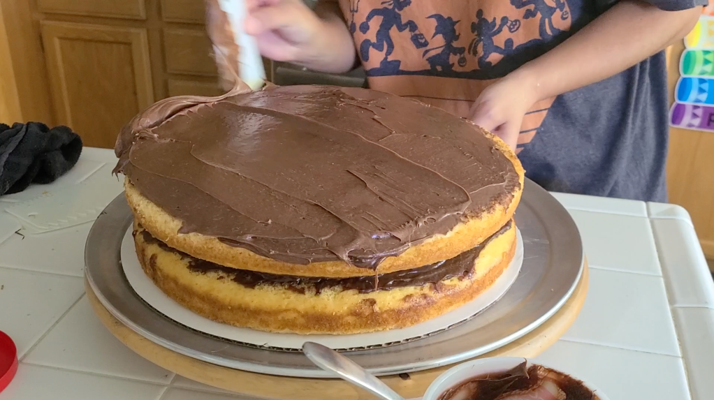 I made two 13 inch cakes and two 8 inch cakes the day before the party. When cooled, I wrapped them in plastic wrap to keep them moist and left them on the counter overnight (the extra cake layers were for another cake I was making for the party)