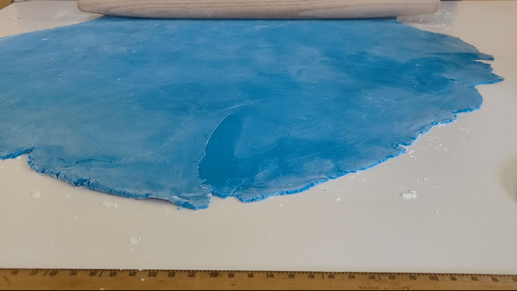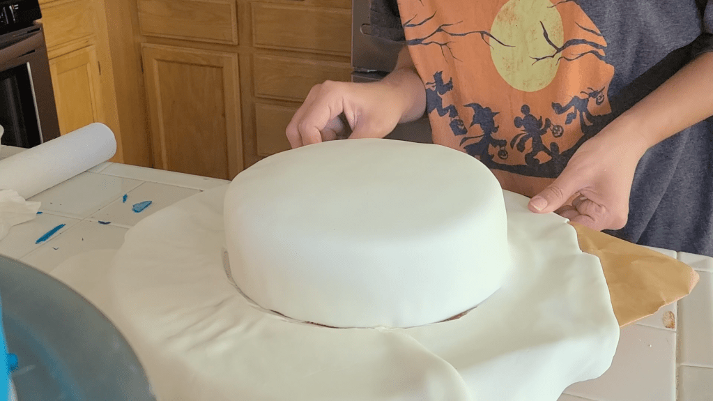 I rolled out a large ball of blue fondant for the two 13 inch cakes. (Tip: to ensure the whole cake is covered in fondant, make the diameter of the fondant a few inches longer than the top and sides of your cake. Also, don’t use too much corn starch, this made my fondant dry causing cracks to form. When rolling out your fondant, use just enough corn starch to keep it from sticking to surfaces