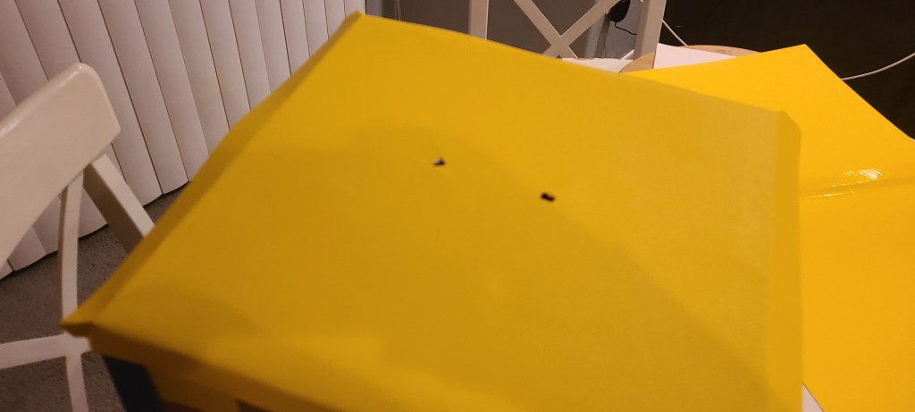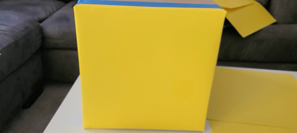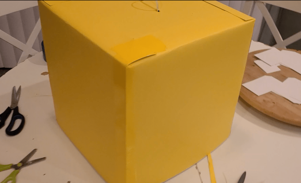I added a 14 x 14 piece of yellow poster paper on top of the box and made two holes matching the holes underneath (Tip: tape the ends of the zip ties to the box before doing this step, so the zip ties don’t fall into the box)