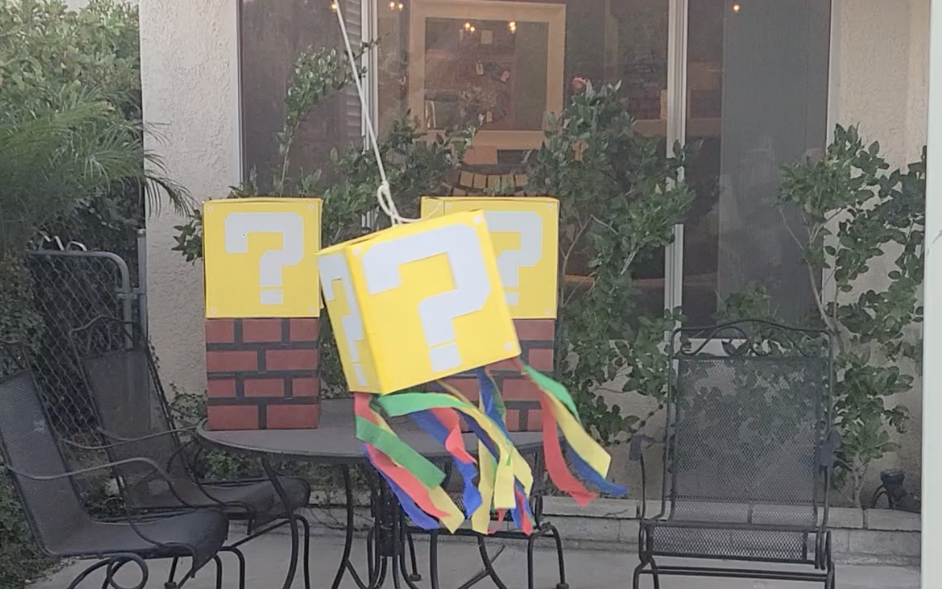 For details, I added a question mark to each side of the box and streamers to the bottom using hot glue. There you have it, a DIY Super Mario question block piñata!
