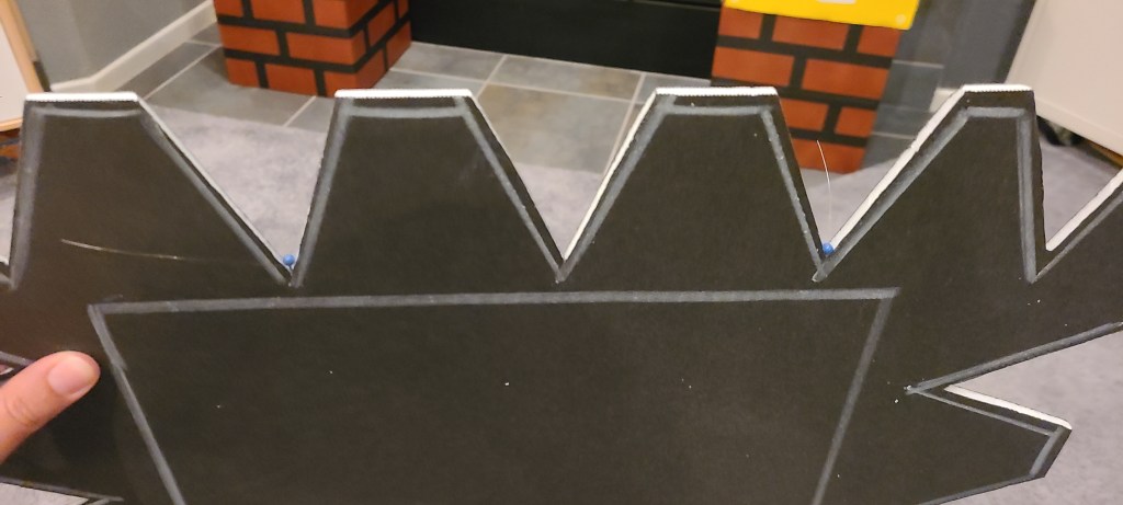I traced around the edge of the Thwomp with white crayon using a ruler and made a rectangle in the center. Finally, I cut and glued a Thwomp face I found on Google images