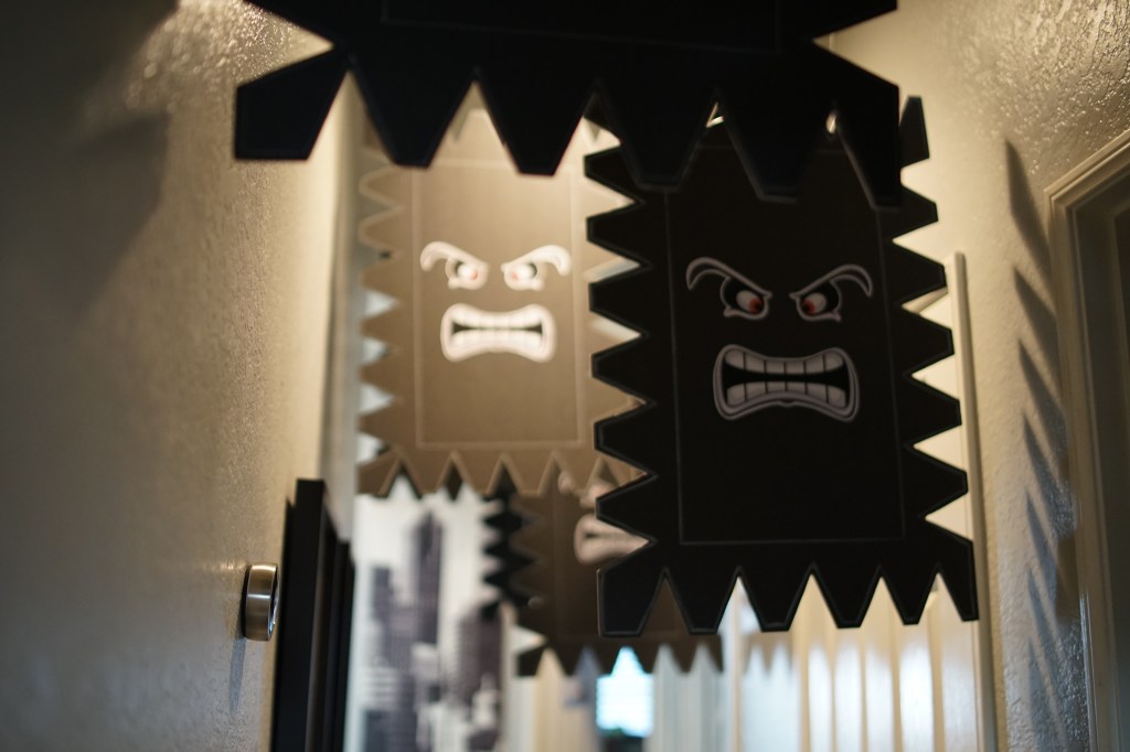I did this on either side on the top of the Thwomp and used clear moving tape to hang them from the hallway ceiling. I hung each Thwomp at a different height to give a falling effect (Tip: hanging the Thwomps is a two person job)