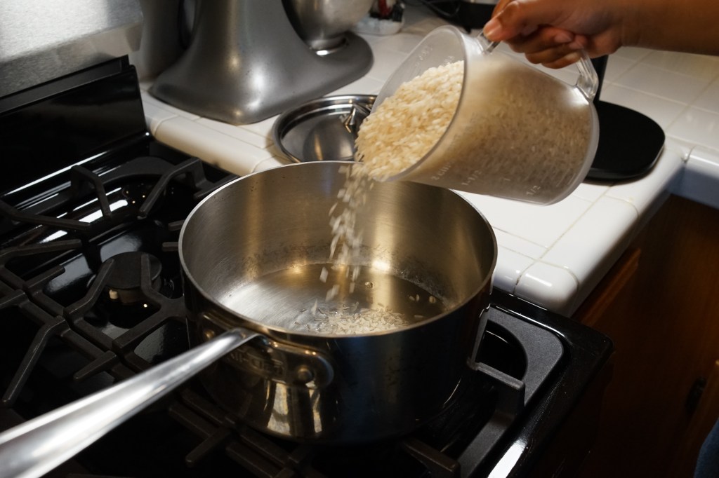 Add refined coconut to oil to pan on medium heat. Once hot, add dry rice (not rinsed). Note: Be sure to use refined coconut oil, which provides a neutral scent and flavor as opposed to unrefined which has a strong coconut flavor and smell