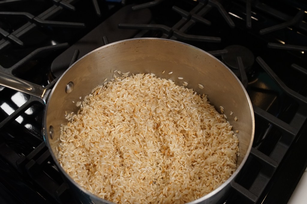 Stir for 5 minutes or until the rice is golden brown and smells toasty