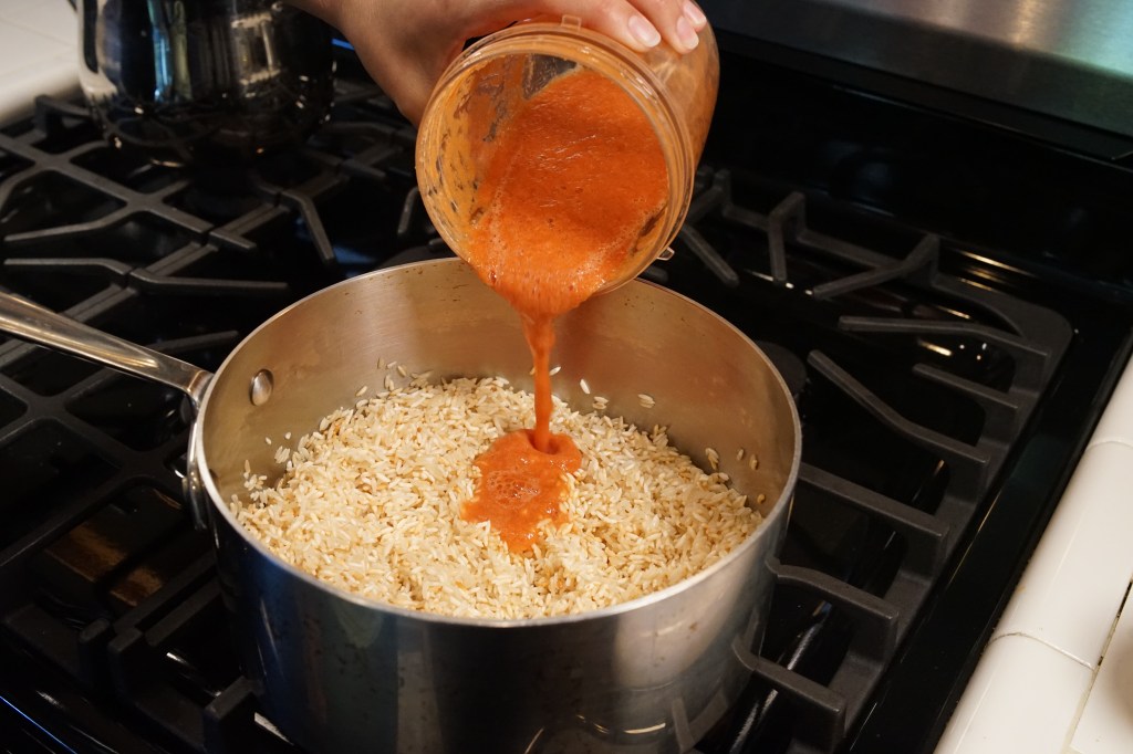 In a blender, add tomato paste, garlic, onion, and water. Blend well and slowly add to toasted rice. Note: Use only a small garlic clove and 1/8 of a small onion, the goal is a subtle hint of these two ingredients. Adding more will overpower the flavor of the dish