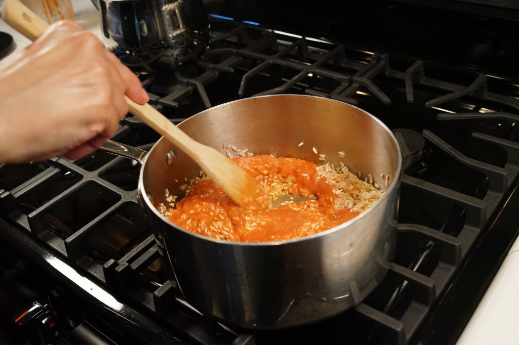 Slowly add tomato paste mixture to rice and stir for 2 minutes