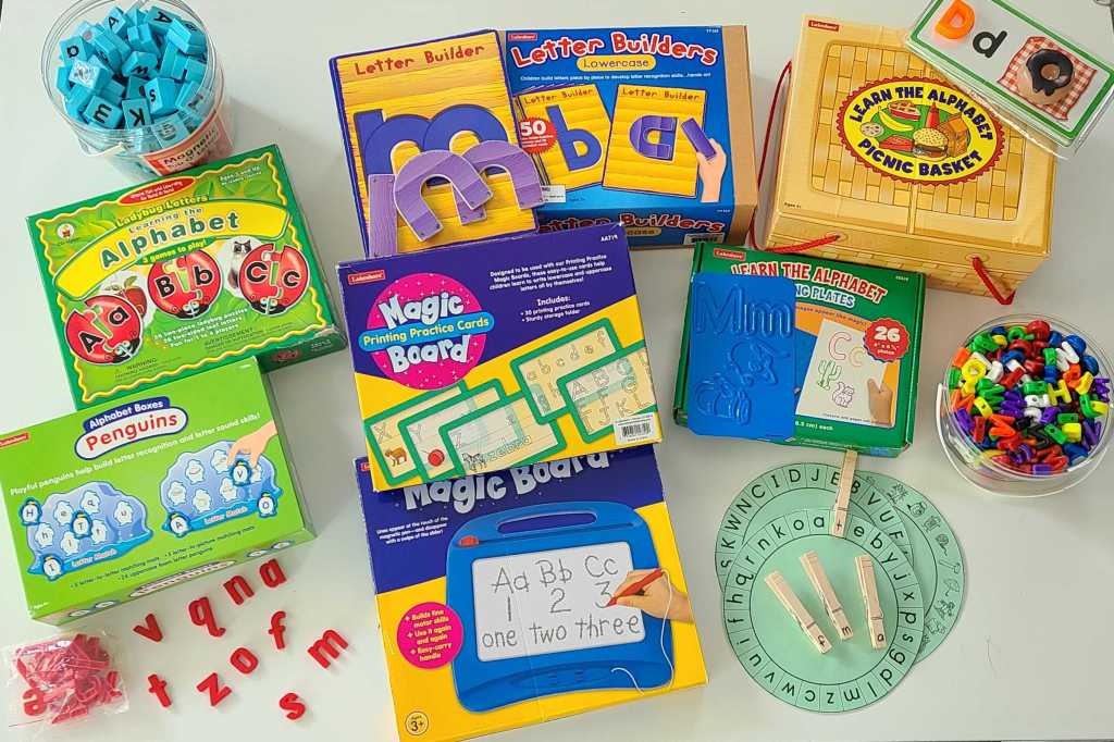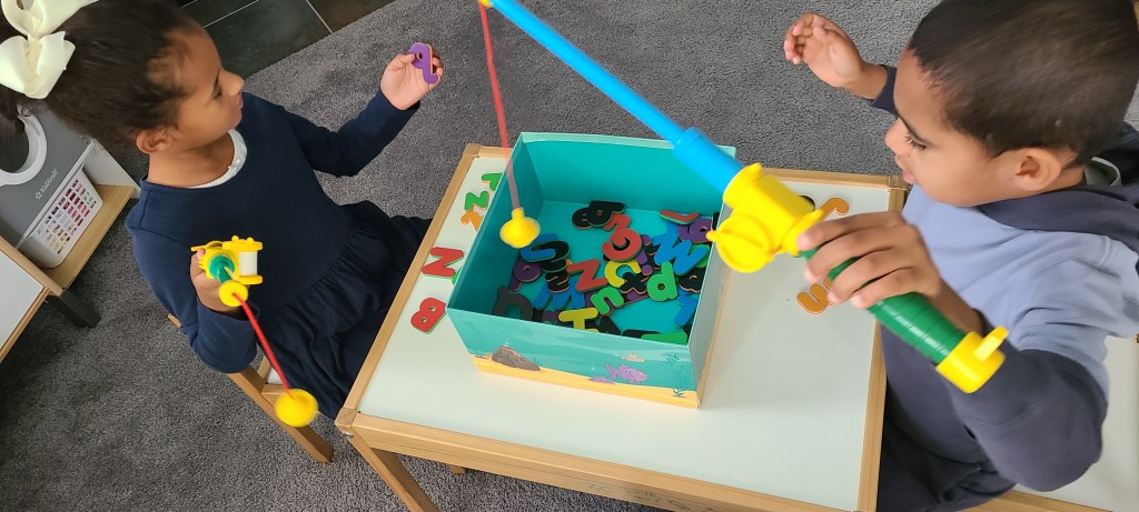 Dump magnet letters in a box and give the kids a magnet or a slotted spoon to help fish out a letter. When they catch a ‘fish’, we say its name and sound
