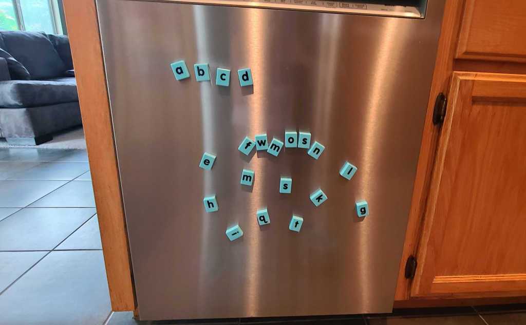 You can play a letter magnet game by putting a few letters on your fridge or dishwasher. Ask your child to point to a specific letter name and or letter sound. Another variation of this game is asking for a specific letter and then putting the letters in abc order (I would have the alphabet display up for this one, so we could reference it together)