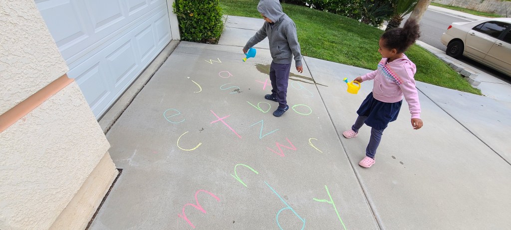 Write letters with chalk on the floor. Have your child spray water over the letter you name with a watering can, spray bottle, or water gun