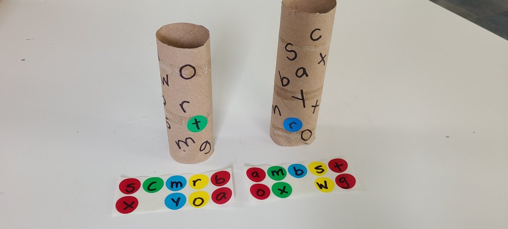 Write some letters with a sharpie onto a paper tube. Write the same letters on colorful circle stickers. Ask your child to put a sticker on the matching letter on the tube