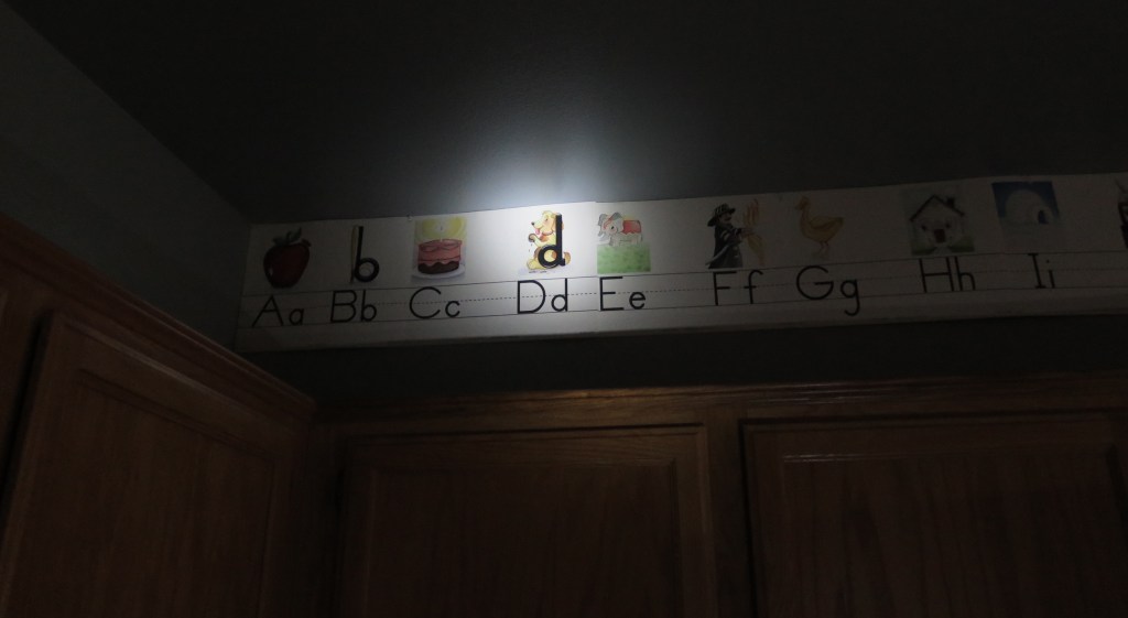 I hung my letter display above the cabinets in our kitchen since the kitchen faces our living room, which is our homeschool space. They refer to it for games, reading, writing, etc. It’s super useful!