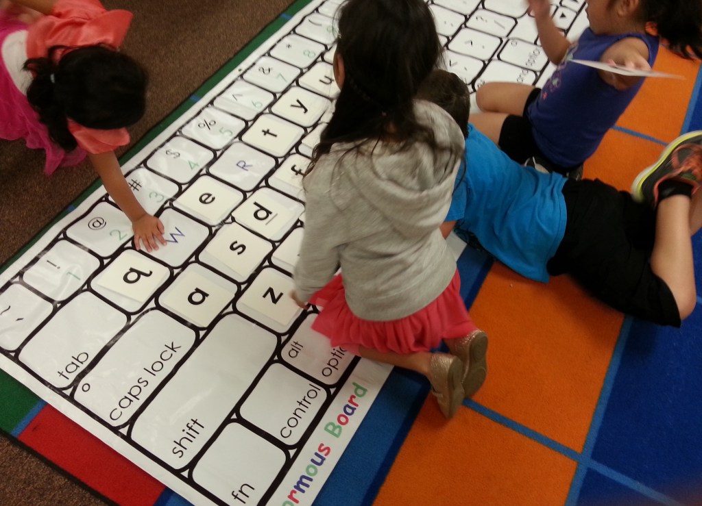 I created a huge computer keyboard called a Normous Board. One of the popular letter games is matching lower case flash cards with the upper case keys. Another is jumping on the letter name and sound that is called out