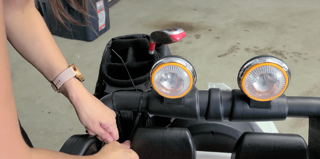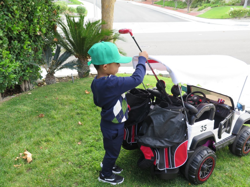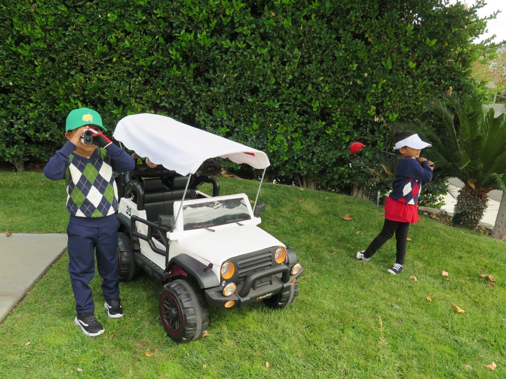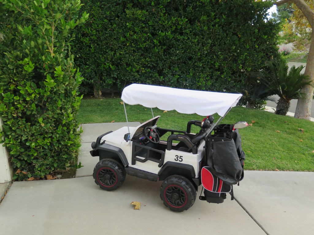 No golf costume is complete without a golf cart to go alongside it! The kids loved riding their golf cart from house to house when they went trick or treating. When it got dark enough, they turned on the headlights and kept on riding, super fun and cute. Read on to find out how I turned my daughter’s pink jeep into a golf cart.