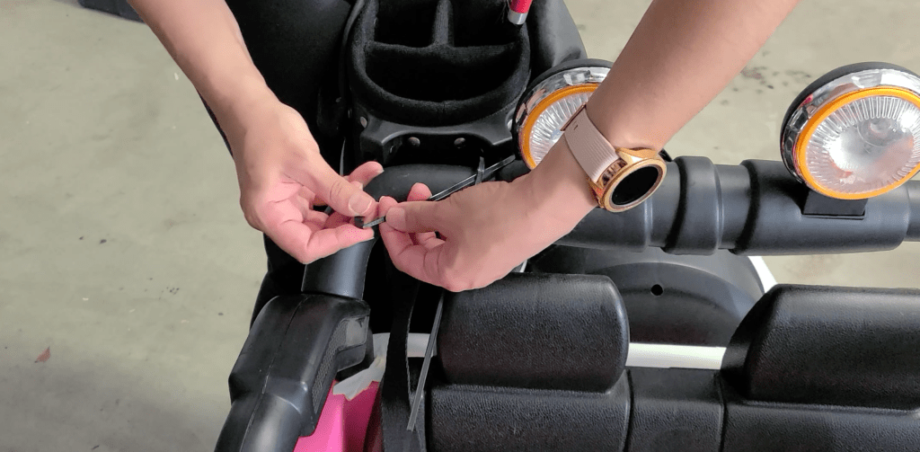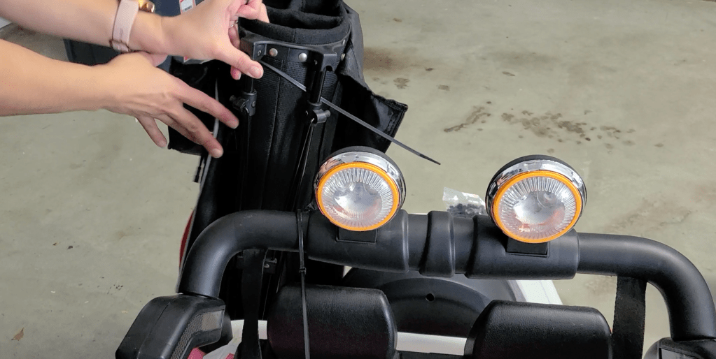 Next, I attached the kids golf bags to the back of the jeep using three long zip ties for each bag. I attached the first zip tie around the back bar of the jeep.