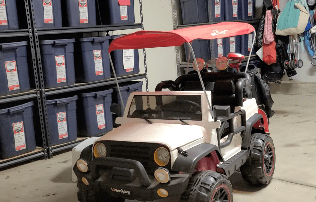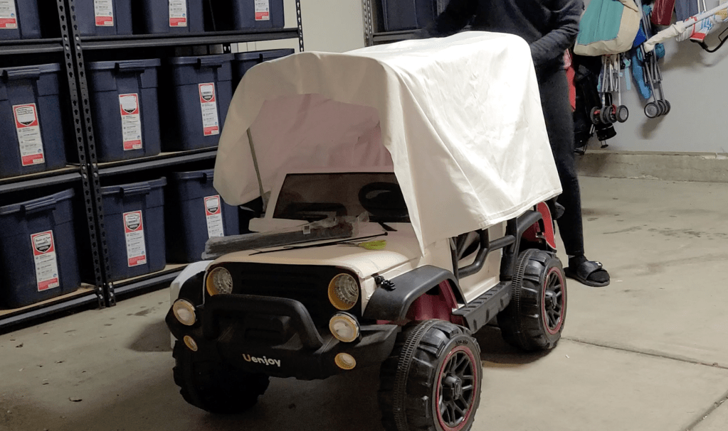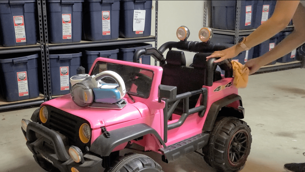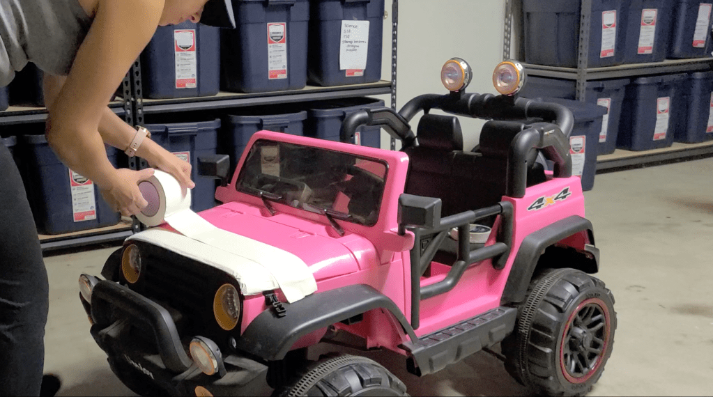 I wanted the golf cart to be white, so I used white painter’s tape to cover up all the pink. If your child’s jeep is already the color you want, consider yourself lucky! This was the most tedious part of the project.