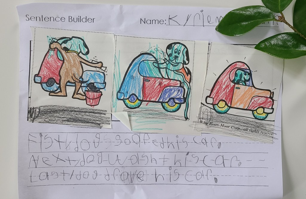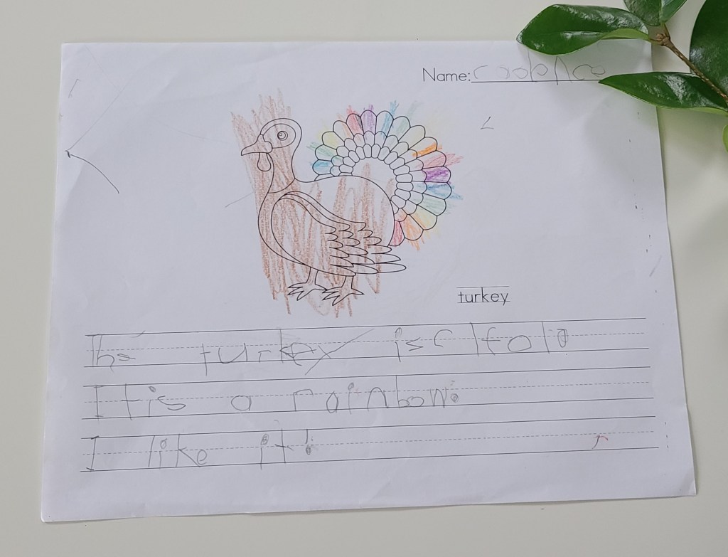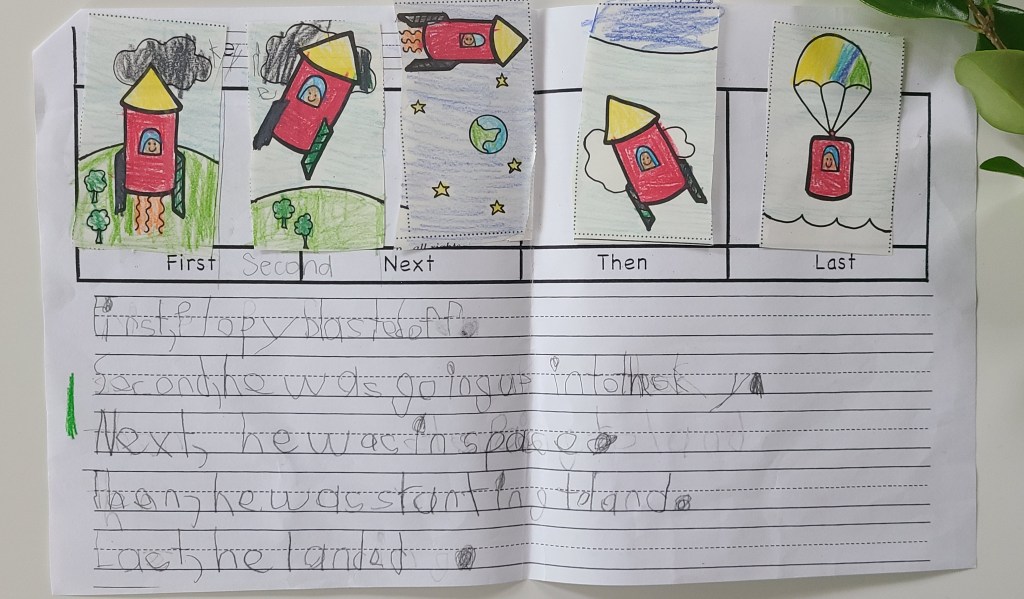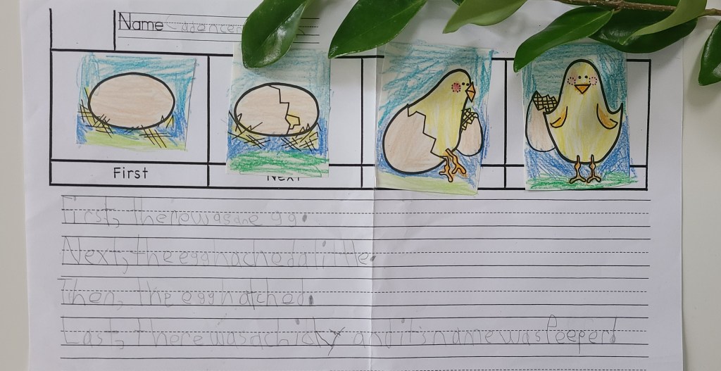 For four picture sequencing, we added the transition word, ‘then’ and wrote four sentences instead of three. For five picture sequencing, we added the transition word ‘second’ and wrote five sentences instead of four. These writing activities took the whole week to complete. We usually wrote one sentence and colored one picture a day. Here are some examples below: