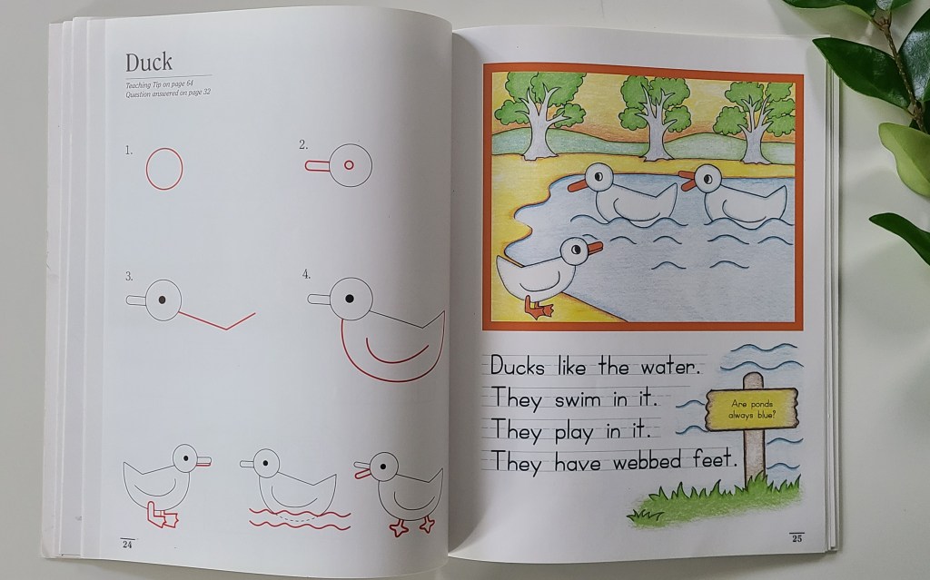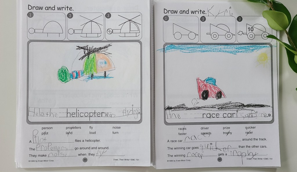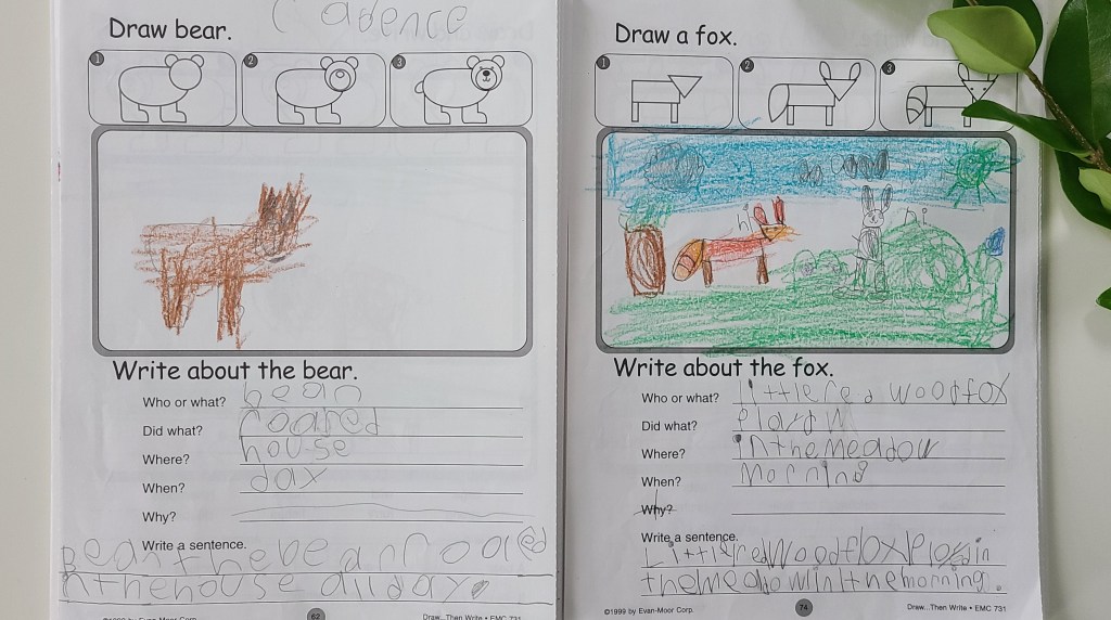 This book was great because the lessons applied to both my kindergartener and my first grader. My son would do the fill in the blank page where he would draw the picture, write a simple sentence under the picture, and fill in the blanks at the bottom of the page