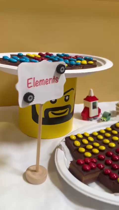 For the dessert table, I made a mini lego banner for one cake and bought a yellow number 6 candle for the other. We made chocolates and rice crispy treats with m&m’s on top to look like mini edible lego bricks