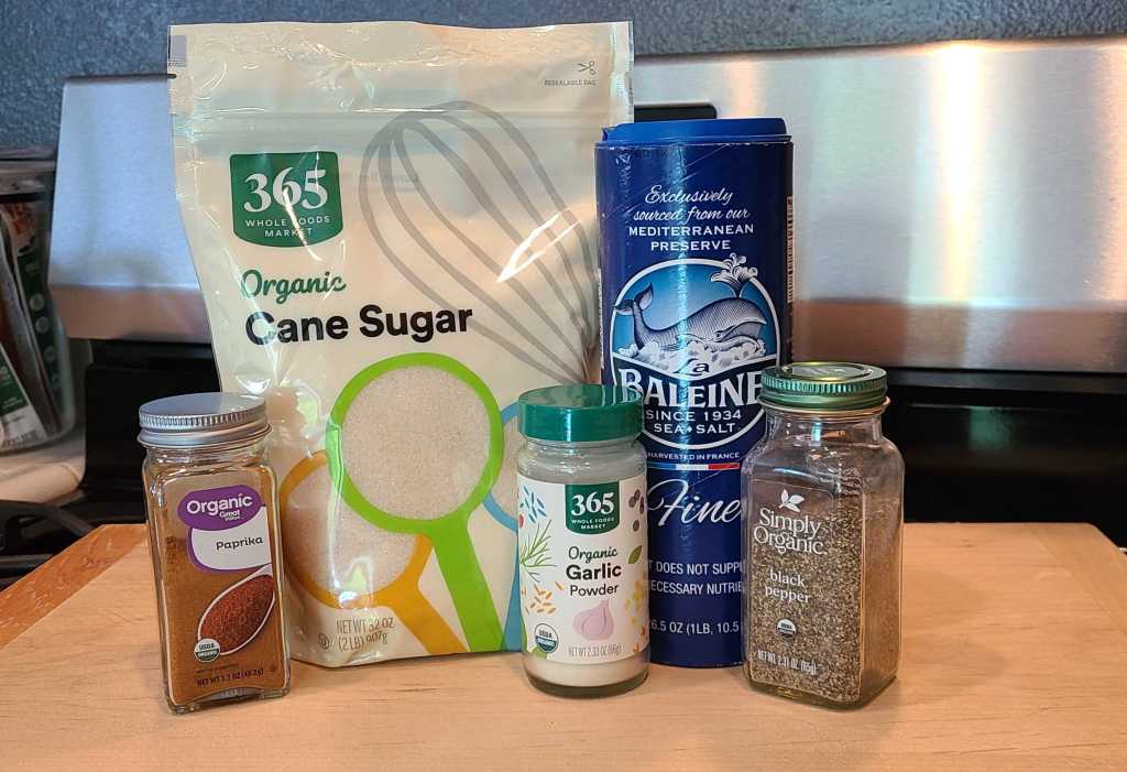 There are a few spices you will massage into the ribs before they go in the oven: sugar, salt, pepper, paprika, and garlic powder. Mix these together and set aside. I like to mix mine in a small Tupperware in case there is extra for next time.