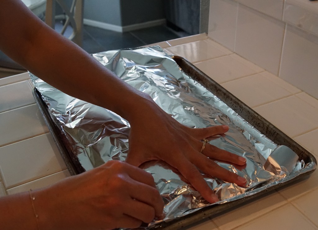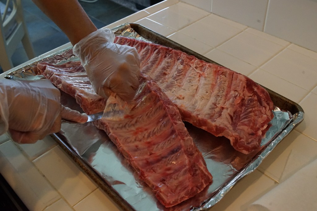 Before adding the dry rub, you’ll want to prep the meat. Line a 13 x 18 cookie sheet with two layers of foil and a sheet of parchment paper. I usually make two racks of ribs so there’s plenty to go around. Flip the racks bone side up and carefully remove the membrane from the back.