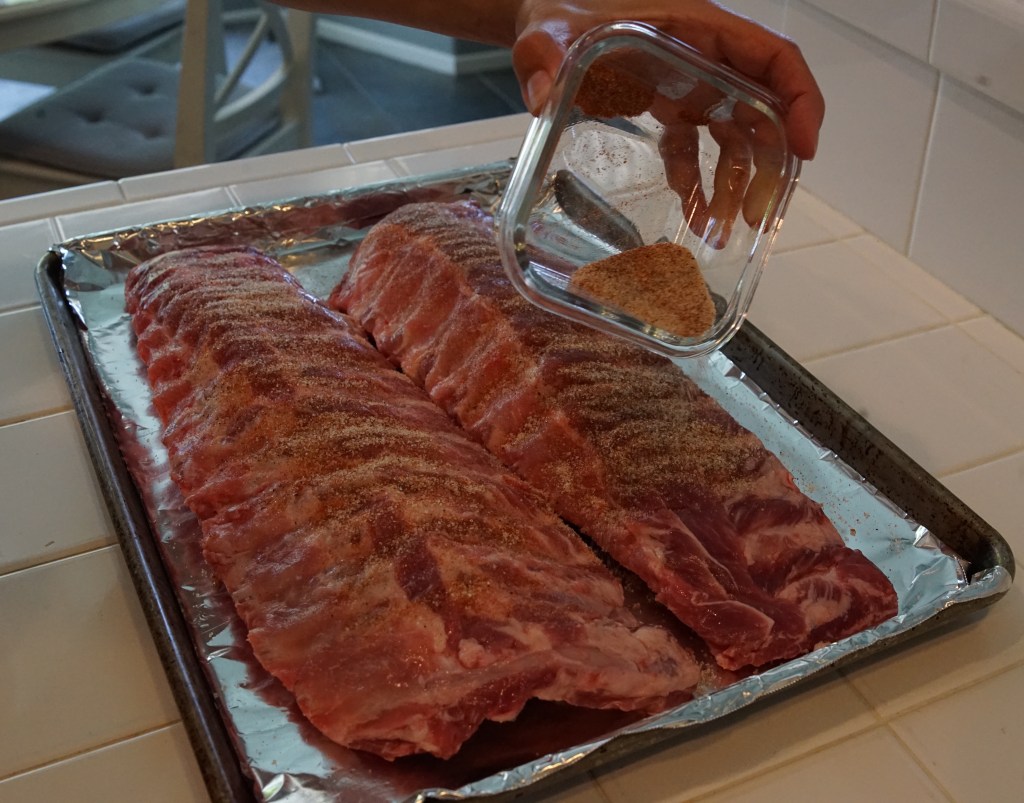 Next, sprinkle the dry rub generously over both sides of the ribs, then work it into the meat to ensure an even coating.