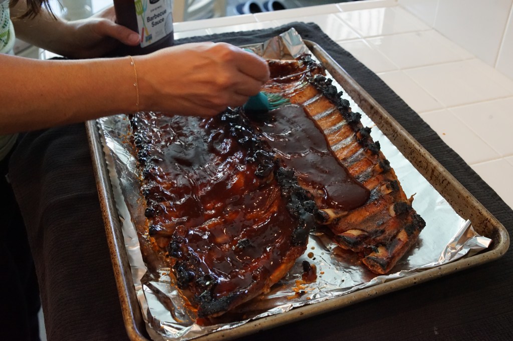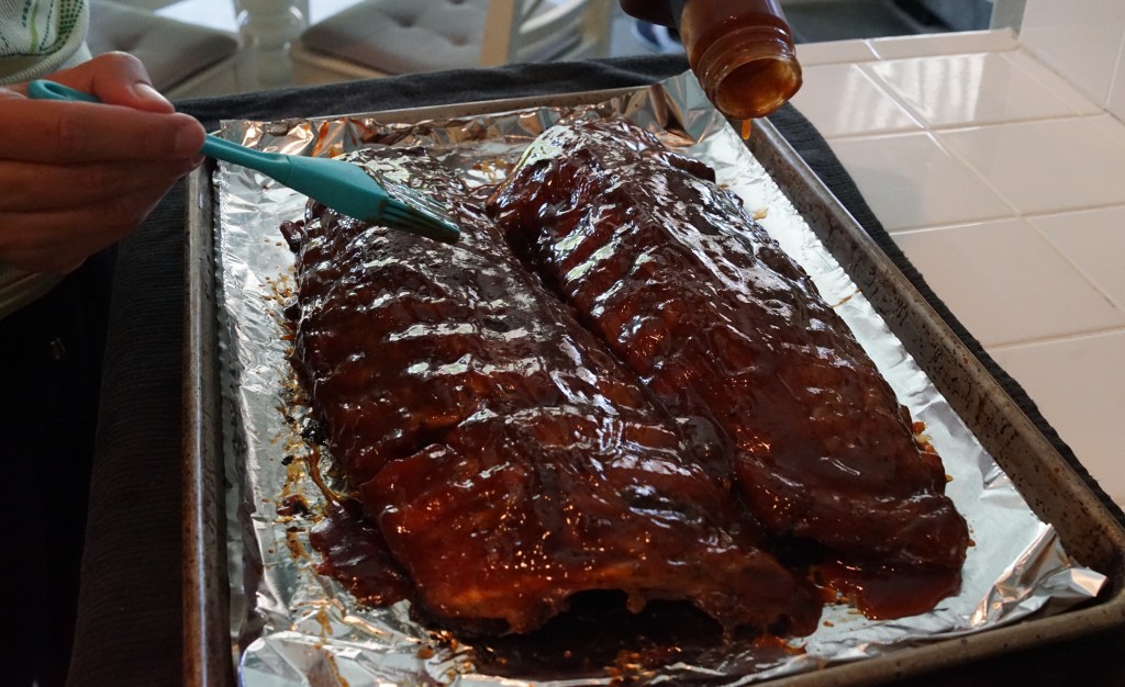 Flip the ribs so they are meat side up, then brush on a generous layer of BBQ sauce. Broil on high for about 4 minutes, or until the sauce is bubbling and caramelized.